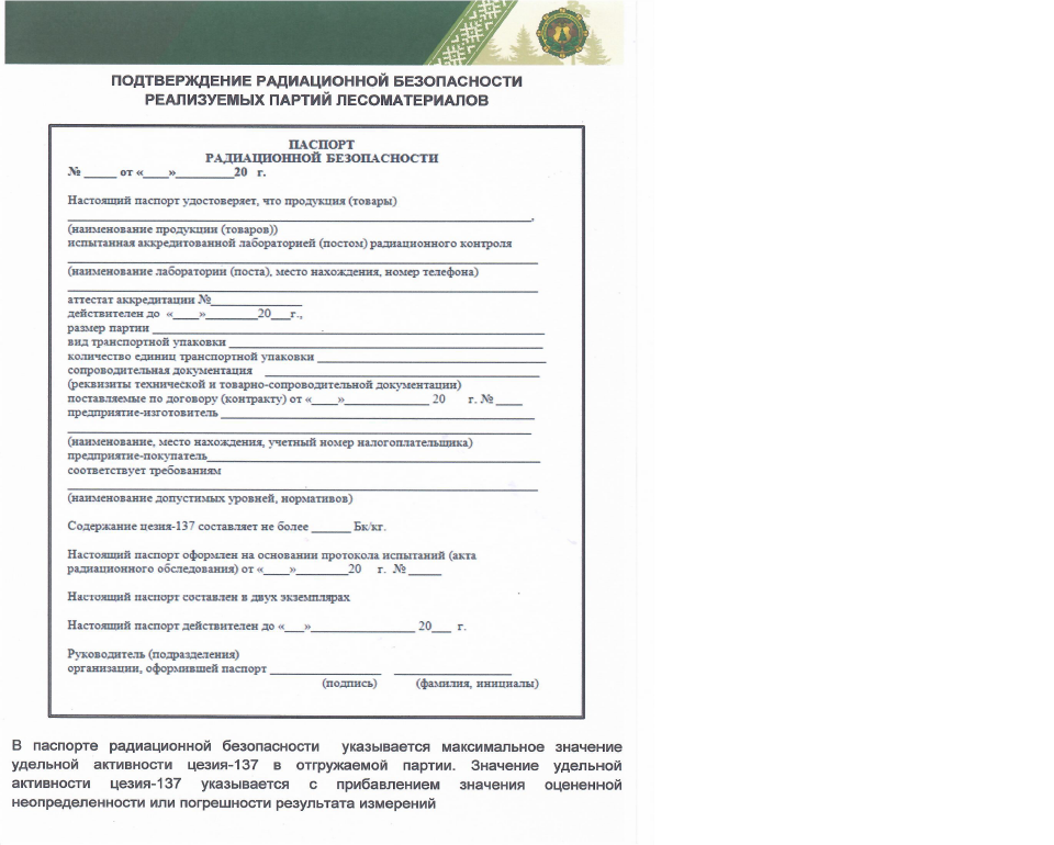 На сопроводительных документах к партии отгружаемой лесопродукции ставится и заполняется оттиск штампа радиационной безопасности или оформляется Паспорт радиационной безопасности.